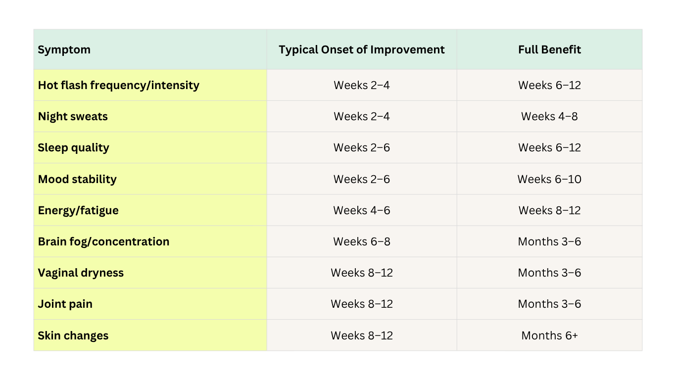 HRT doesn't work on a single timeline, it works on multiple timelines simultaneously, with each symptom driven by a different biological mechanism. Hot flashes respond in weeks. Brain fog responds in months. Tissue-level changes take longer still.