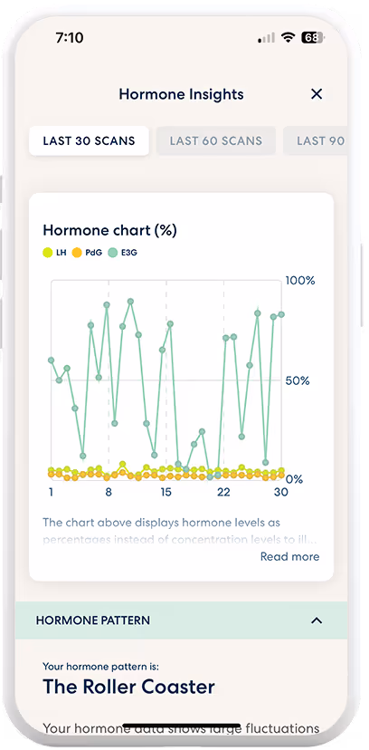 Oova tracks three hormones, luteinizing hormone (LH), E3G (urinary estrogen), and PdG (progesterone) to give you insights into how each hormone fluctuates.